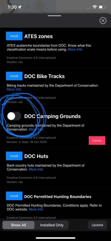 Individual layers first need to be installed by tapping the install button, and can then be turned on and off using the show/hide button. The update button will show if further updates to the layer are available. The delete button will delete the layer from your phone.