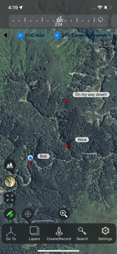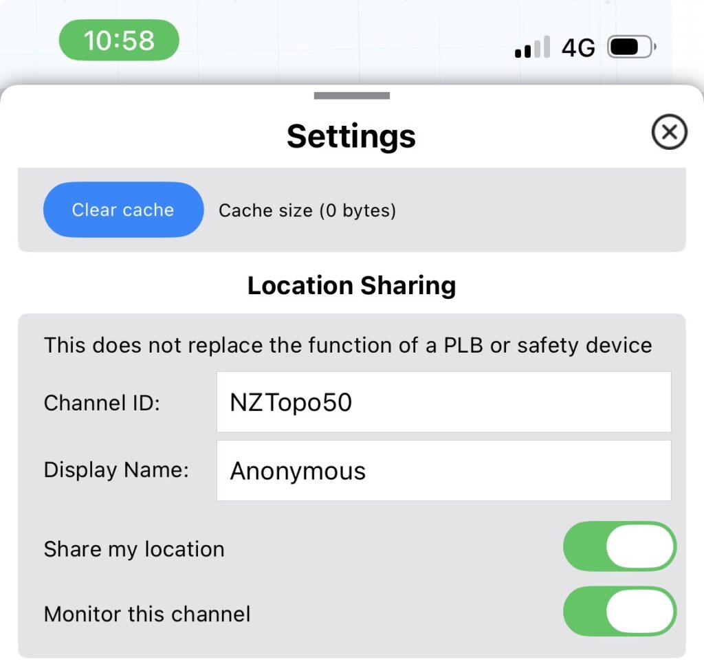 If you choose to turn it on, then your GPS location (easting, northing, altitude) along with the Channel ID, the display name you have chosen, and a random id number, are sent to our server. This information is anonymous and we have no way to connect the information sent with you personally (you’ll have noticed that you don’t need an account to use the NZTopo50 app). The id number is only used to connect one location update with previous ones from the same phone and differentiate it from other people sharing locations on the same channel. The text you use for your display name is shared but can be any string of characters and numbers and doesn’t need to include any real names (unless you want these shared as well).